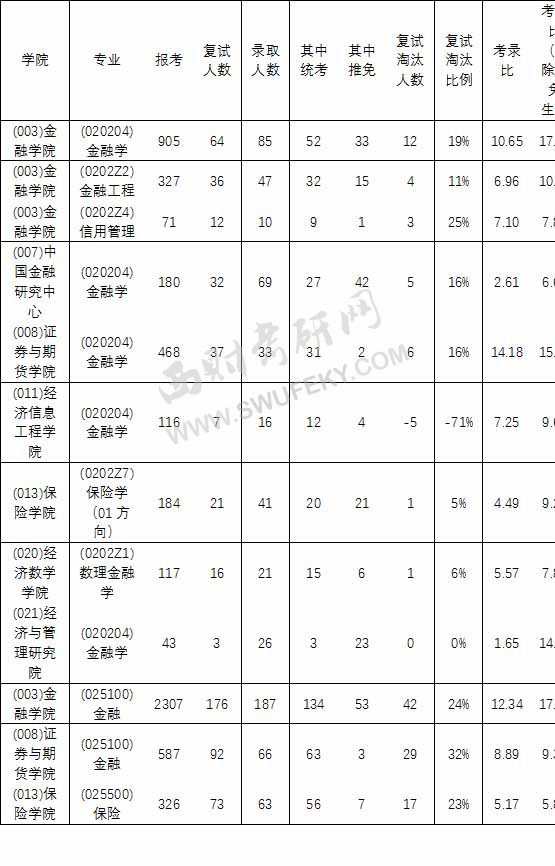 前言 本文旨在通过分析相关专业的考录比、分数段分布情况、师资力量、深造率、就业质量,力求准确的为考生进一步分析各专业的录取难度以及专业前景,节约考生查找资料时间,为考生提供事半功倍的帮助。 内容 金融专业作为西财历年热门专业,深受广大学子追捧。金融作为经济学下的二级学科,拥有众多分类,西财的金融学科包括:金融学(金融学院)、金融学(证券与期货学院)、金融学(经济信息工程学院)、金融学(经济与管理研究院)、金融学(中国金融研究中心)、金融工程(金融学院)、数理金融学(经济数学学院)、保险学(保险学院)、信用管理(金融学院)以及这些学硕专业对应的专硕专业。面对如此多的学院和专业,考生在报考前合理分析各个学院及专业的实力,考取难度,就业质量等合理选择,避开热门,显得尤为重要。本文目的即为考试提供相关资料并加以分析,力图为考生报考提供专业的帮助。 一、专业简介: 金融学、金融(金融学院):金融学院的金融学和金融这两个专业,一个是学硕专业,一个是专硕专业,学科内容都大同小异:都偏向于金融实务,并且比金融学(证券与期货学院)更为宏观,涉及银行、证券、信托、投资、保险等。研究生主要的专业必修课有:金融经济学、公司金融、金融资产定价,从研究生教授的三门专业必修课也可以看出,金融学院教授的课程更偏向于对于基础理论的夯实。 金融学、金融(证券与期货学院):证券与期货学院于2008年成立的,成立的时间比金融学院晚,因此它的成立必然吸收了金融学院的营养,但是同样又具有自己的特点:培养证券、期货方面的专业性人才,因此在学科内容上相对金融学院更为微观,主要集中于证券与期货领域。研究生主要的专业必修课有:投资学、公司金融、实证金融,在教授课程上也可以看出比金融学院更专。 金融学(经济信息工程学院):此专业是培养金融电子化方向的人才,而金融电子化方向的目标就是培养既懂金融业务知识又懂得应用信息技术的高素质复合型高级专业人才。在如今这个“互联网+”的年代,将金融与互联网融为一体的人才极为稀缺,应该说这个专业很好的迎合了时代要求。 金融学(经济与管理研究院):经济与管理学院在2014年以前,只招收推免生,但自从2014年以后,它开放了对于统招生的录取。它在师资力量和科研实力方面优势极其明显,其授课老师全为海归博士,授课全部采用双语教学,在授课内容上,除了强化金融基础理论,同时着重培养学生的国际化视野。 金融学(中国金融研究中心):中国金融研究中心在经济与管理研究院开放接收统招生之前,应当说是众多考生心目中的梦想,中国金融研究中心在2000年9月被正式列为教育部人文社会科学百所重点研究基地之一。作为教育部唯一的国家级金融研究基地,中心依托国内一流的金融学科实力和建设水平,与中国人民银行金融研究所合作,组成了一支具有国内一流水平的金融研究队伍,共同致力于推动本学科的发展以及对中国金融改革与发展中面临的重大理论、实践问题的研究。中心在授课内容上,与其他学院的金融学并无二致,但是由于在中心授课的老师在金融业界都具有相当大的影响力,因此决定了中心的金融学备受热捧。 金融工程(金融学院):金融工程是属于金融学院下的一个专业,主要涉及金融产品设计开发、金融衍生产品定价等方面,与金融学不同,这个专业偏向于金融建模,因此对数学的要求很高,由于金融学院本身的大环境是偏向于金融实务,因此这个专业在师资力量上显得不是那么充分,但是由于背靠金融学院这一王牌学院,所以报考的考生也络绎不绝。 数理金融学(经济数学学院):数理金融学是属于经济数学学院下的专业,与金融学院的金融工程有太多相似之处,都是通过数学建模来解决金融问题,要求学生具备较强的数学功底。由于经济数学学院的老师本身就具备很强的金融与数学素养,因此在这个学院学习数理金融学应该说是再合适不过的了。 保险学、保险(保险学院):保险同样是金融学科的一个重要分支,西财的保险是国家级重点学科,研究方向主要包括风险管理与保险、国际保险会计、保险精算。保险一直是我们国家大力扶持的一个产业,一些保险行业的尖端人才国内十分缺乏,西财的保险一直致力于培养我国保险行业的领军人才。 信用管理(金融学院):西南财经大学金融学院的信用管理专业是有关金融、财务分析和管理的学科。这个专业着重于培养学生管理信用交易(商业信用、消费者信用和银行信用等)的风险及资信评级的能力,信用管理学生的专业要求是毕业后有足够的专业能力去商业银行从事内部评级和用信用衍生产品对信用风险进行套期保值管理、去信用管理中介机构从事外部评级和产品开发与服务、去大型企业从事资信调查和客户关系管理、去行业监管部门从事信用政策制订与实施监督等工作。依托金融学院这个强大的背景,西财的信用管理大有可为。 总结:西财金融学科群的每一个专业都各有特色,充分满足每一位考生的个性化需求:想从事金融实务的,可以选择金融学;想从事金融产品设计的,可以选择金融工程和数理金融学;想在金融更深层次的领域有所建树的,可以选择保险和信用管理。即便同样是金融学,还有五种选择:想师从大师,选择中国研究中心;想立足国际,培养国际化视野,选择经