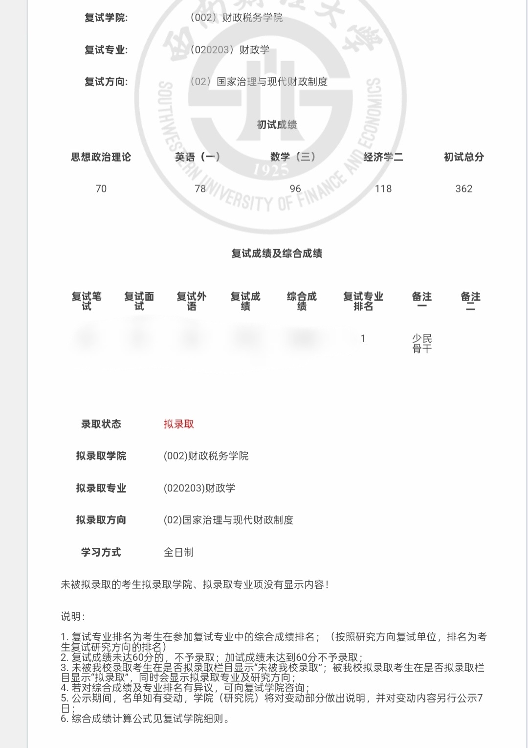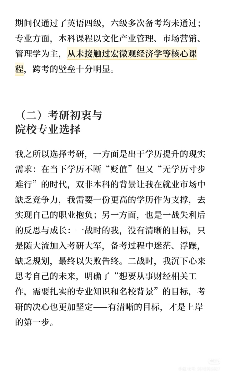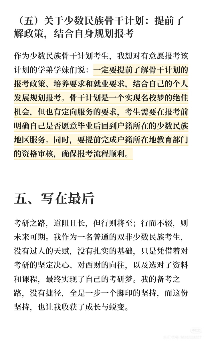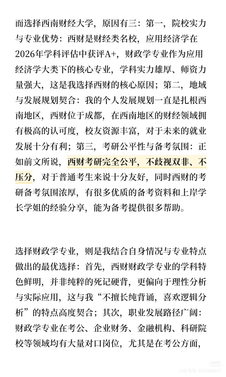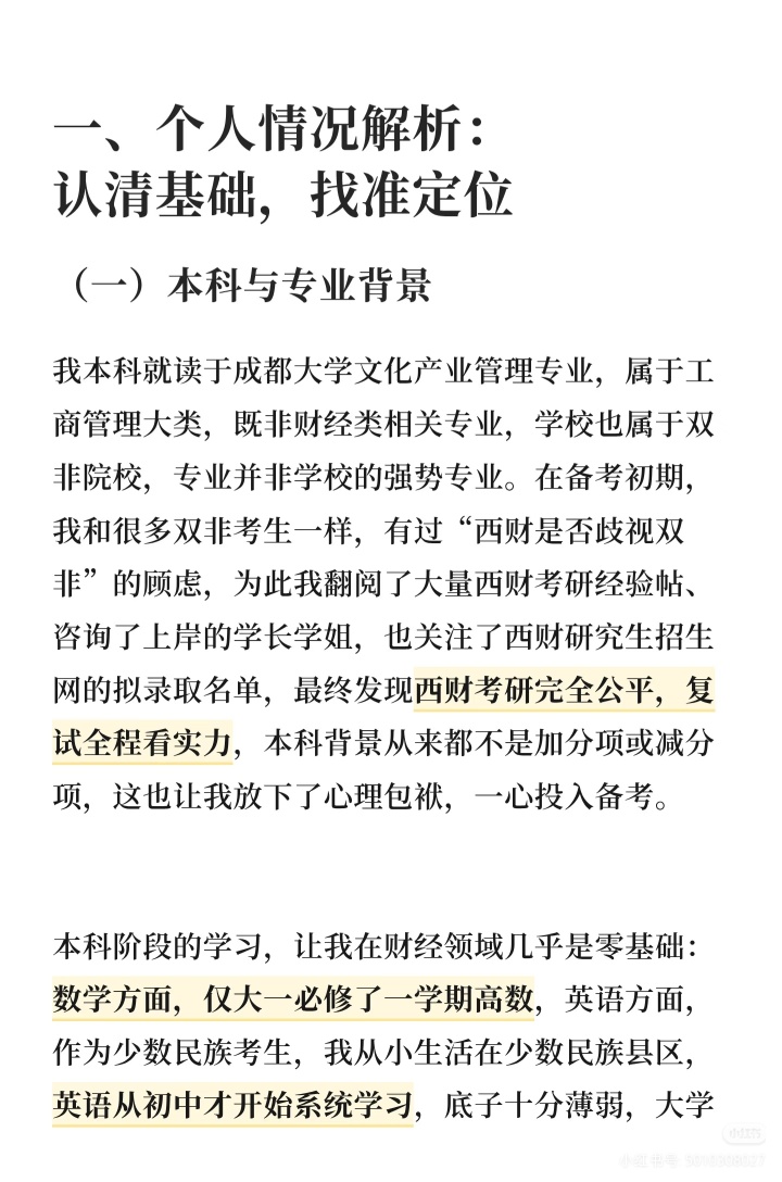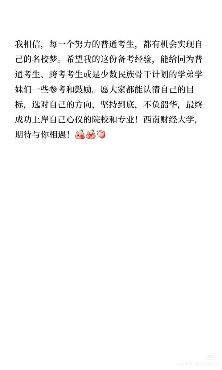 作为一名本科就读于成都大学文化产业管理专业的双非学生,同时也是少数民族骨干计划的考生,我经历了考研一战的迷茫失利,也迎来了二战的目标清晰、稳步上岸。从大一仅学过一学期高数的数学零基础,到大学英语仅过四级的薄弱底子,再到跨考西南财经大学应用经济学A+学科下的财政学专业,我的备考之路没有捷径,全是一步一个脚印的摸索与坚持。现将我的备考全过程详细分享,希望能给同为普通考生、跨考考生或是少数民族骨干计划的学弟学妹们一些参考。