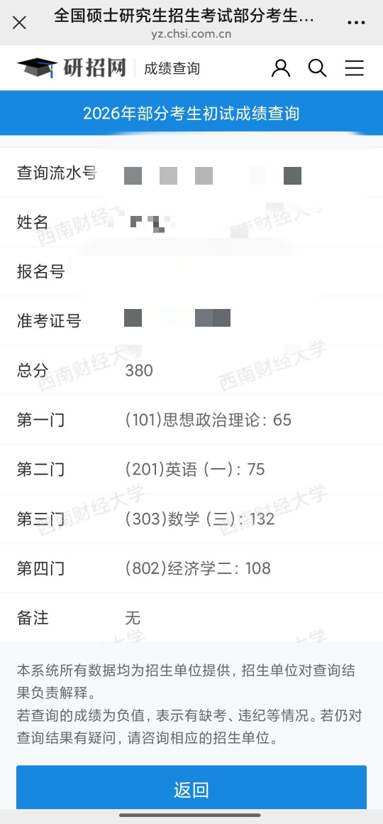 我是西南财经大学计算机学院本科生,今年跨考本校金融工程,总分380分,其中数学三132、英语一75、政治65、经济学802专业课108分。选择跨考是因为金融工程是计算机与金融的交叉学科,能用上我的本科基础,我也对这个方向很感兴趣。